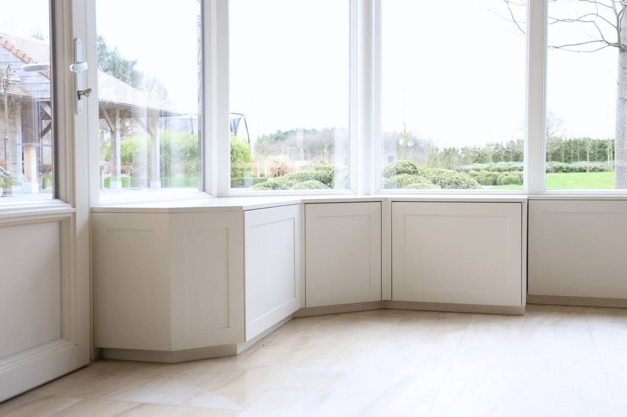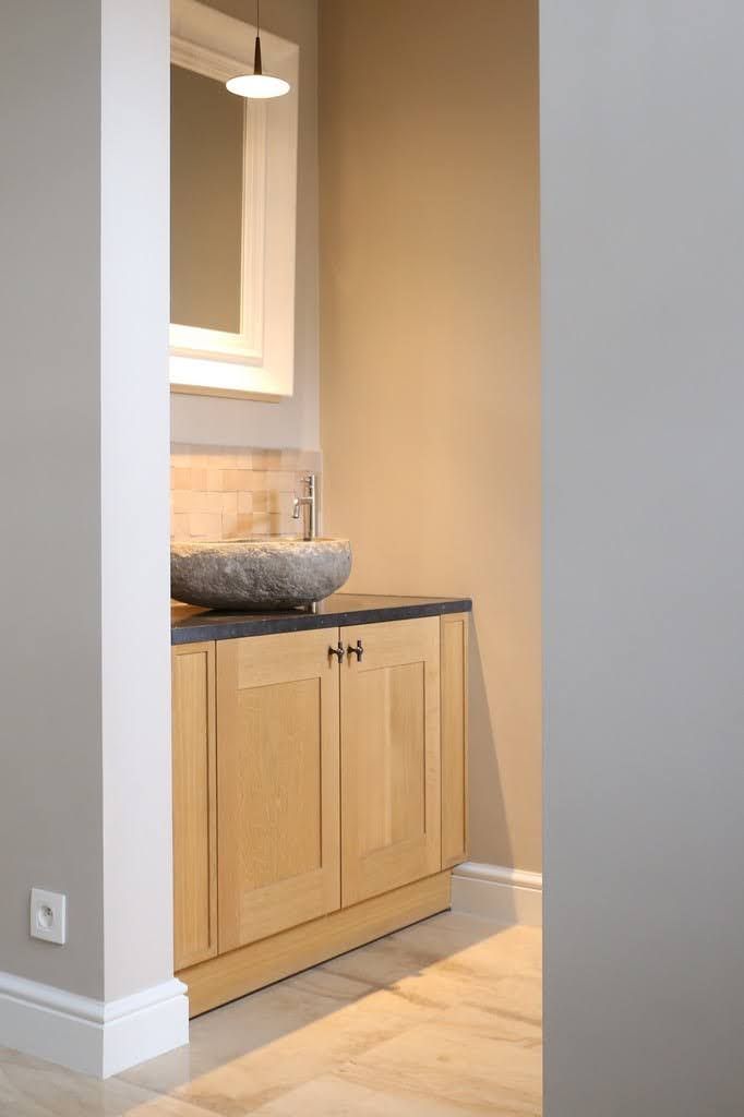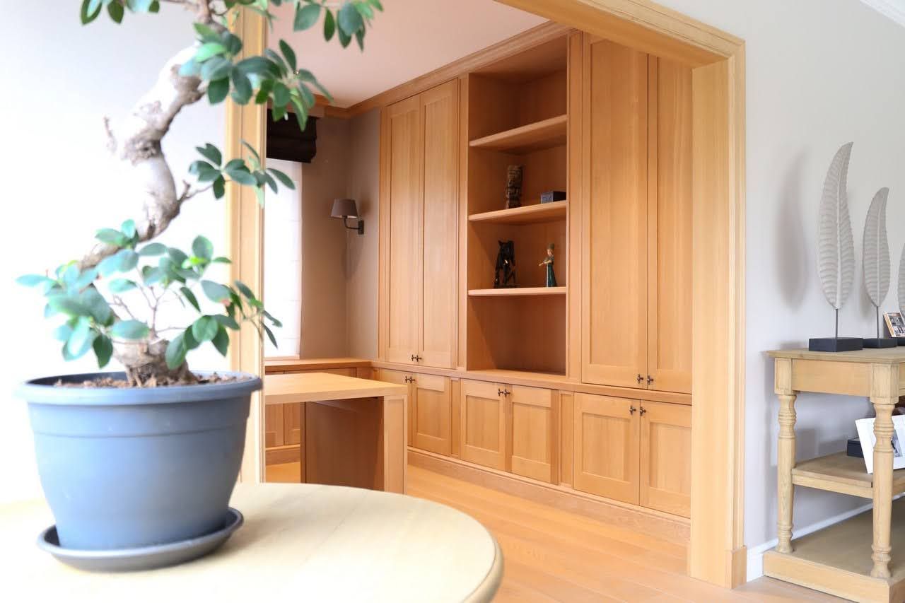 Een totaalinrichting met maatwerkkasten in een klassieke nieuwbouwwoning. Harmonieuze kleuren combineren een stijlvolle, functionele en uitnodigende leefomgeving. Laat je inspireren door een creatief ontwerp.